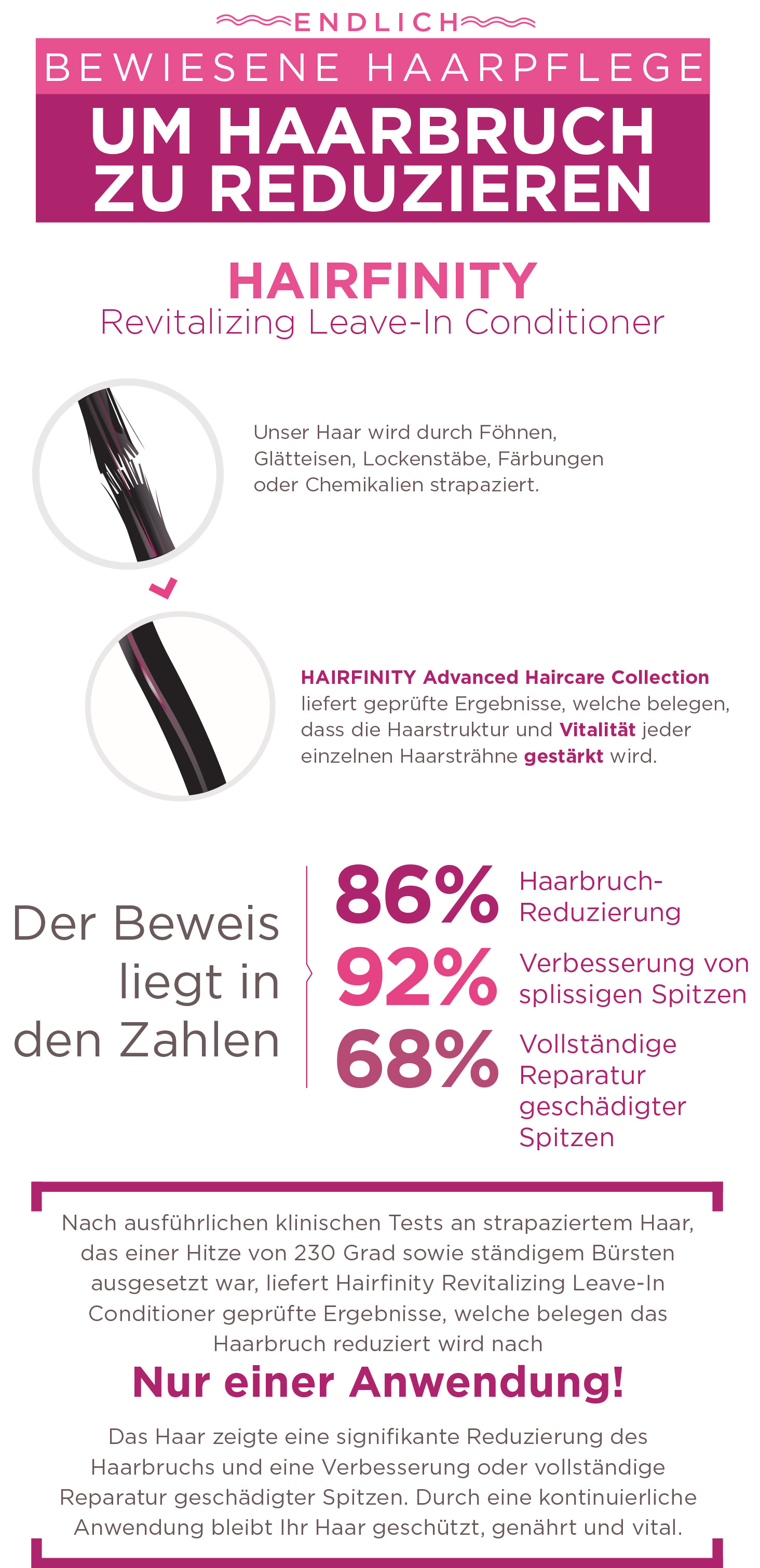 HAIRFINITY Revitalizing Leave-In Conditoner Ist ein ein sanftes Leave-in Spray, das die Haare vor alltäglichen Stressfaktoren schützt. Es pflegt das Haar, indem es dieses entwirrt, glättet und erweicht. Durch die ultra-nährende Mixtur, bestehend aus Mineralien, wird die Haarwurzel effektiv gestärkt, Frizz reduziert und der Glanz wiederhergestellt.  Zudem wird das Haar vor Hitze-Stylings und Umwelteinflüssen geschützt. Die nährende Mixtur wird vom Haar schnell absorbiert ohne dieses zu fetten. Das Ergebnis.... weiches und strahlendes Haar.